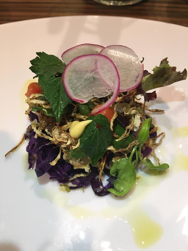 - Carpaccio di tonno rosso marinato agli agrumi e soia, cavolo viola, gel di pomodoro, senape, scalogno, ravanelli, croccante di finocchio e germogli